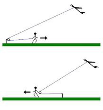 WINCH: In Australia, a very popular method of launching a plane these days, is the electric winch. Although not a cheap system (typically $850 plus, without a battery), it is very dependable, strong and easy to use. In its simplest form, a winch consists of a car starter motor, with a drum attached to its shaft. This is then mounted to a frame. Power is provided by a deep-cycle l2V battery and activated through an automotive solenoid. The solenoid is triggered by a foot pedal, which is connected to it by a cable. Step on the pedal, and the motor spins up immediately to about 2,000rpm, pulling the line in, and winding it onto the drum. Again we always launch the glider towards the wind. Here is a picture of a hand winch method where a person walks with the line instead of using an electric motor to wind it in.